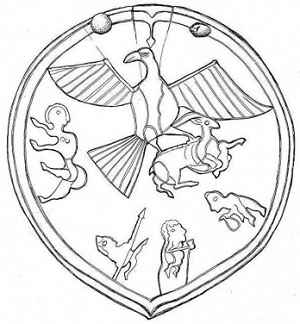 центральной нагрудной бляхе – орел, несущий в когтях козла, и люди,